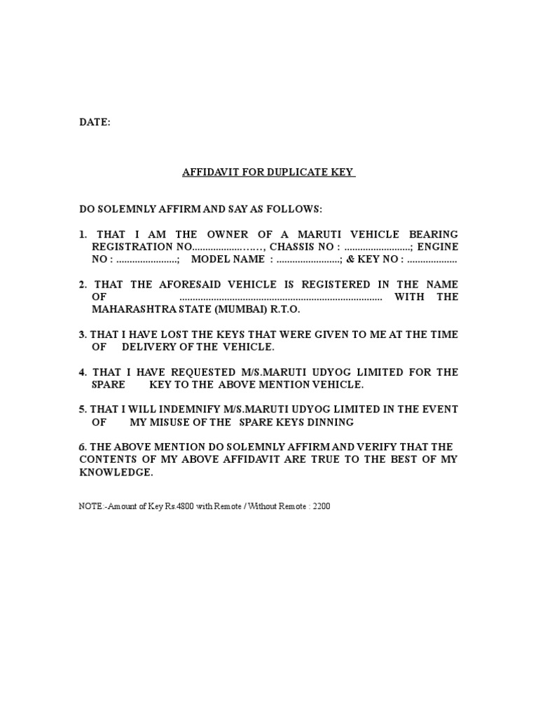 Request for a Duplicate Vehicle Key Affidavit | PDF