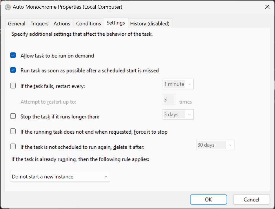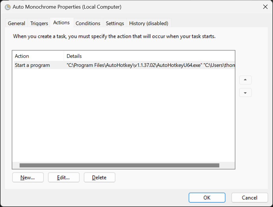 Unable to get Task Scheduler to engage Autohotkey script for Monochrome ...