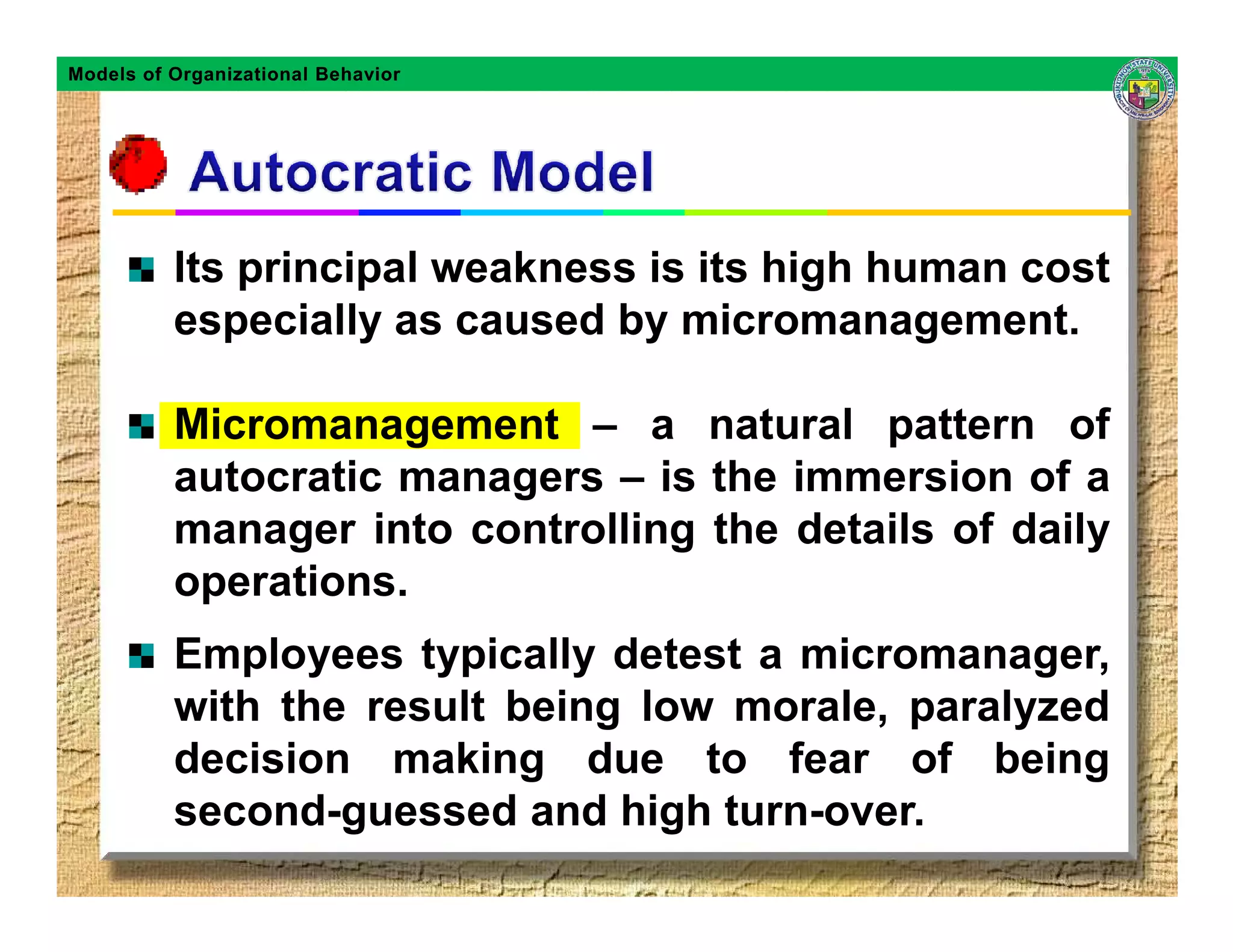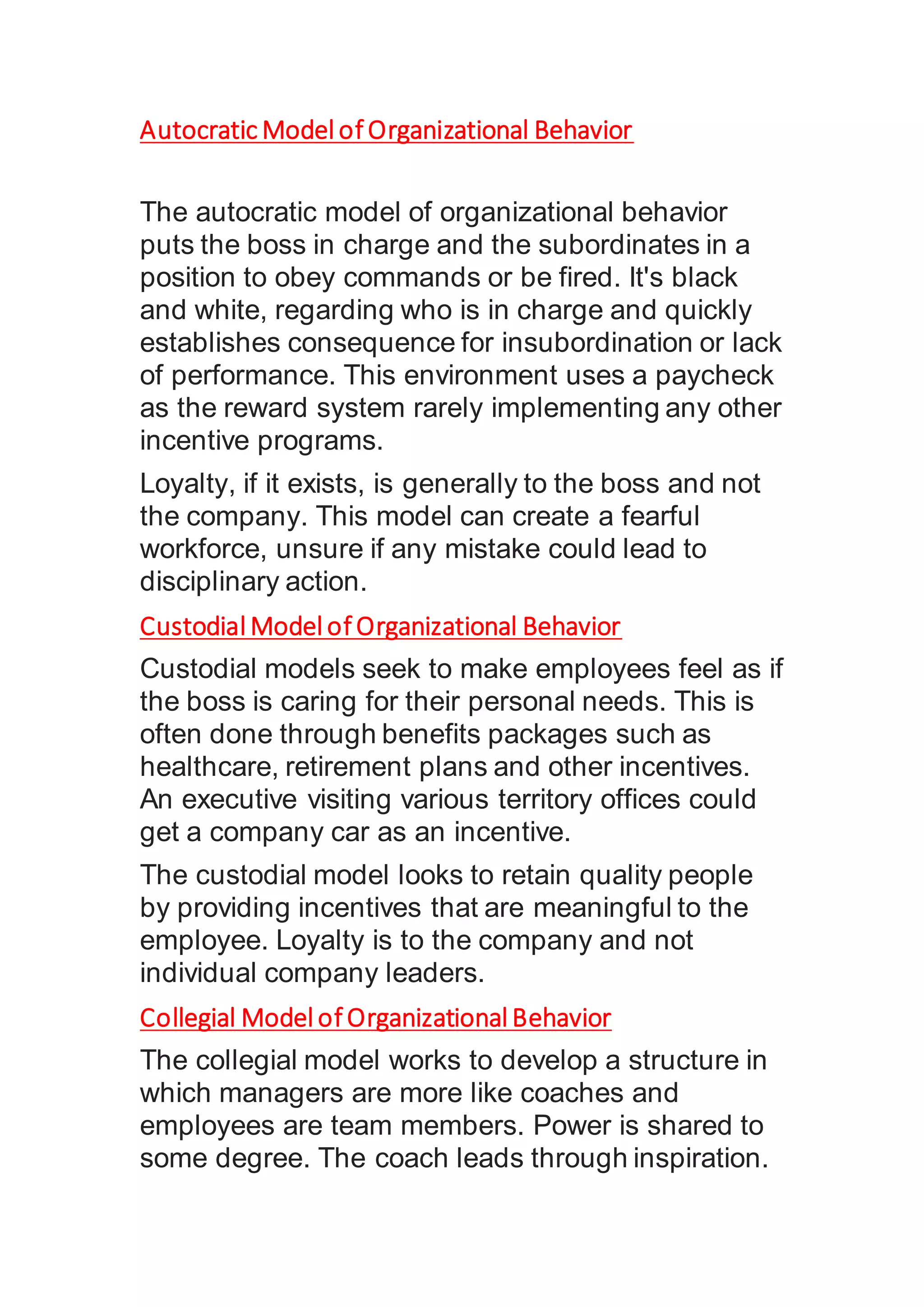 The Five Models of Organizational Behavior: - Autocratic - Custodial ...