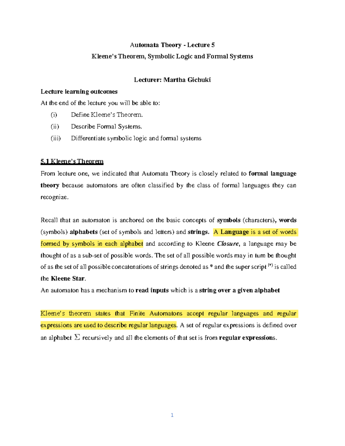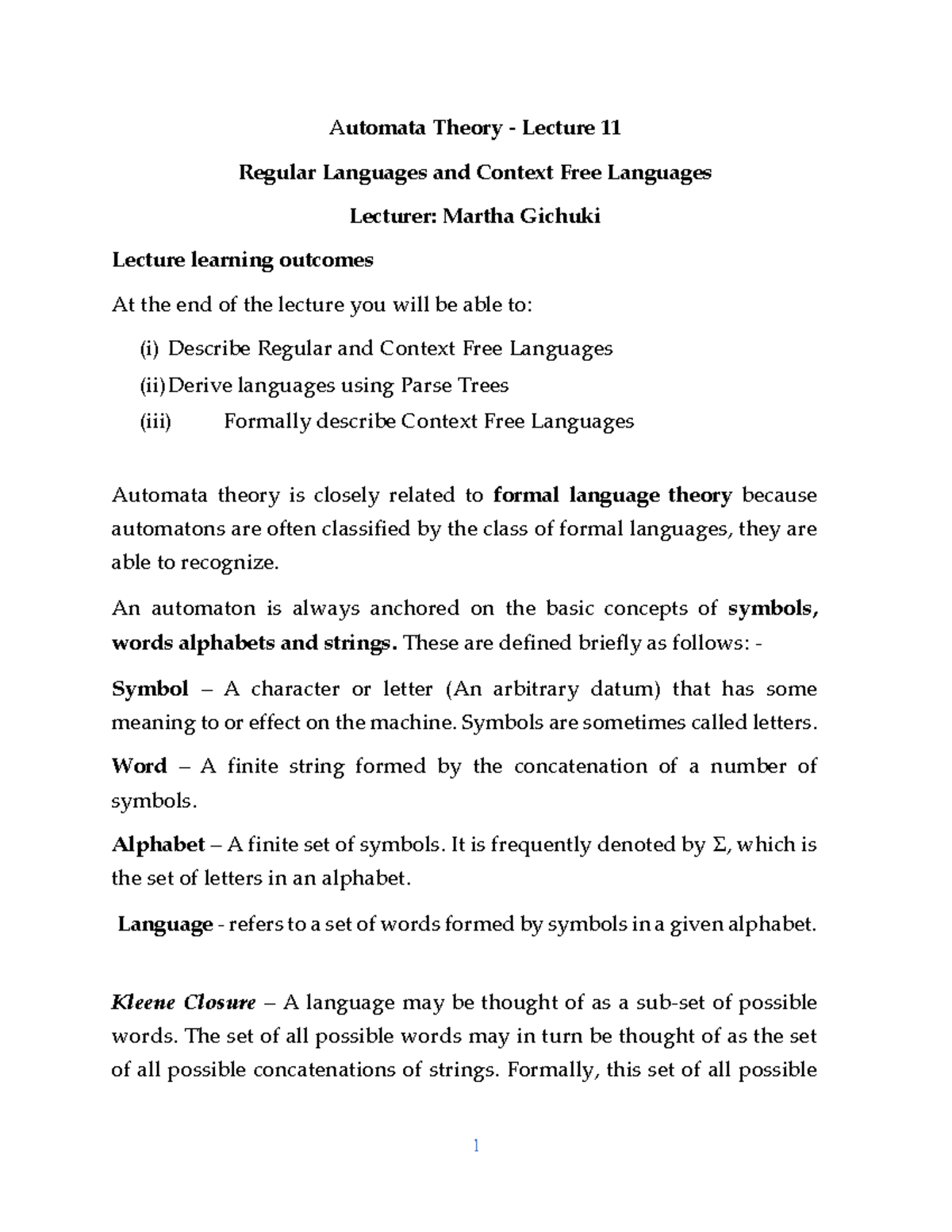 Automata Theory Lecture 11: Regular & Context Free Languages - Studocu