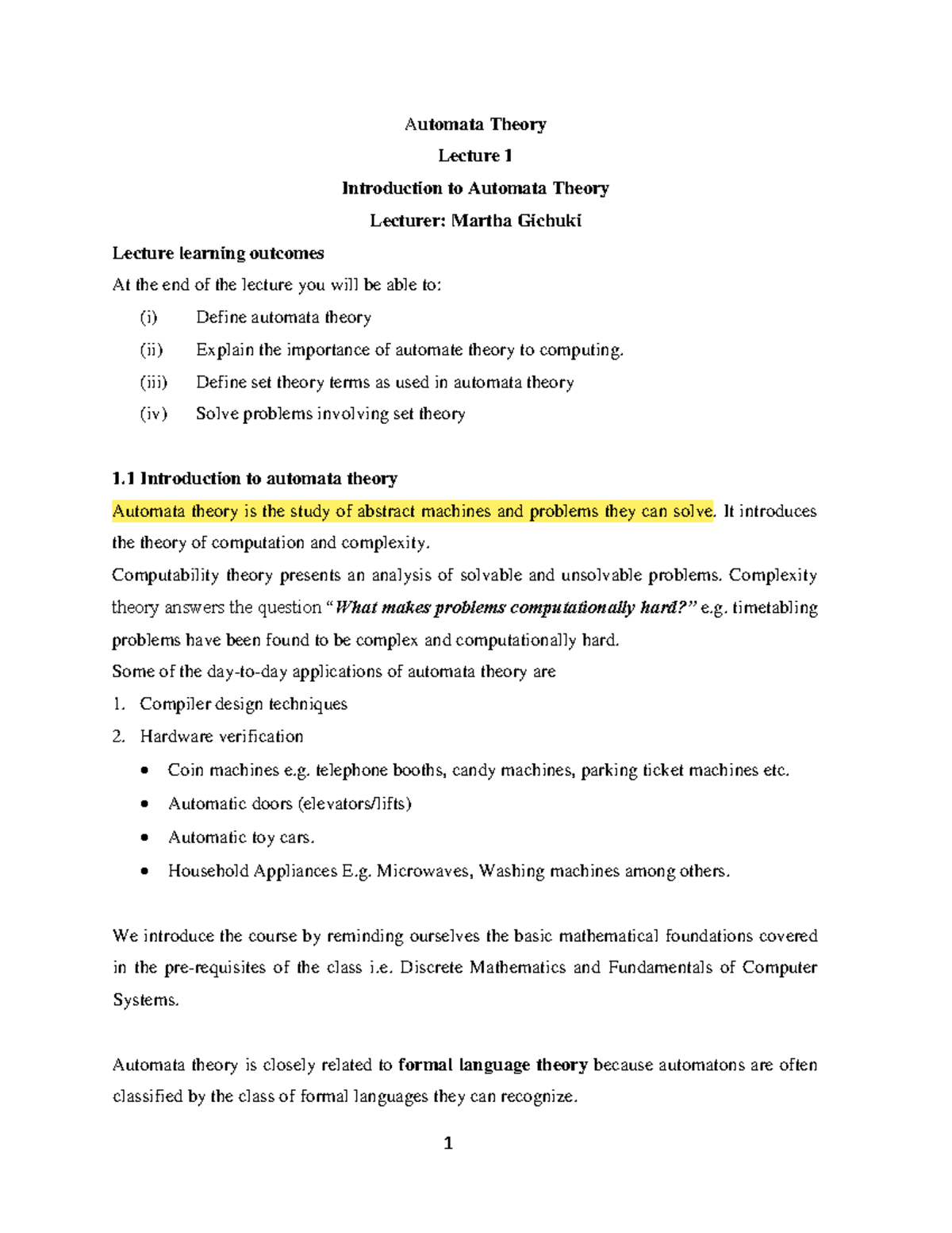 Automata Theory - Lecture 1: Introduction & Key Concepts - Studocu