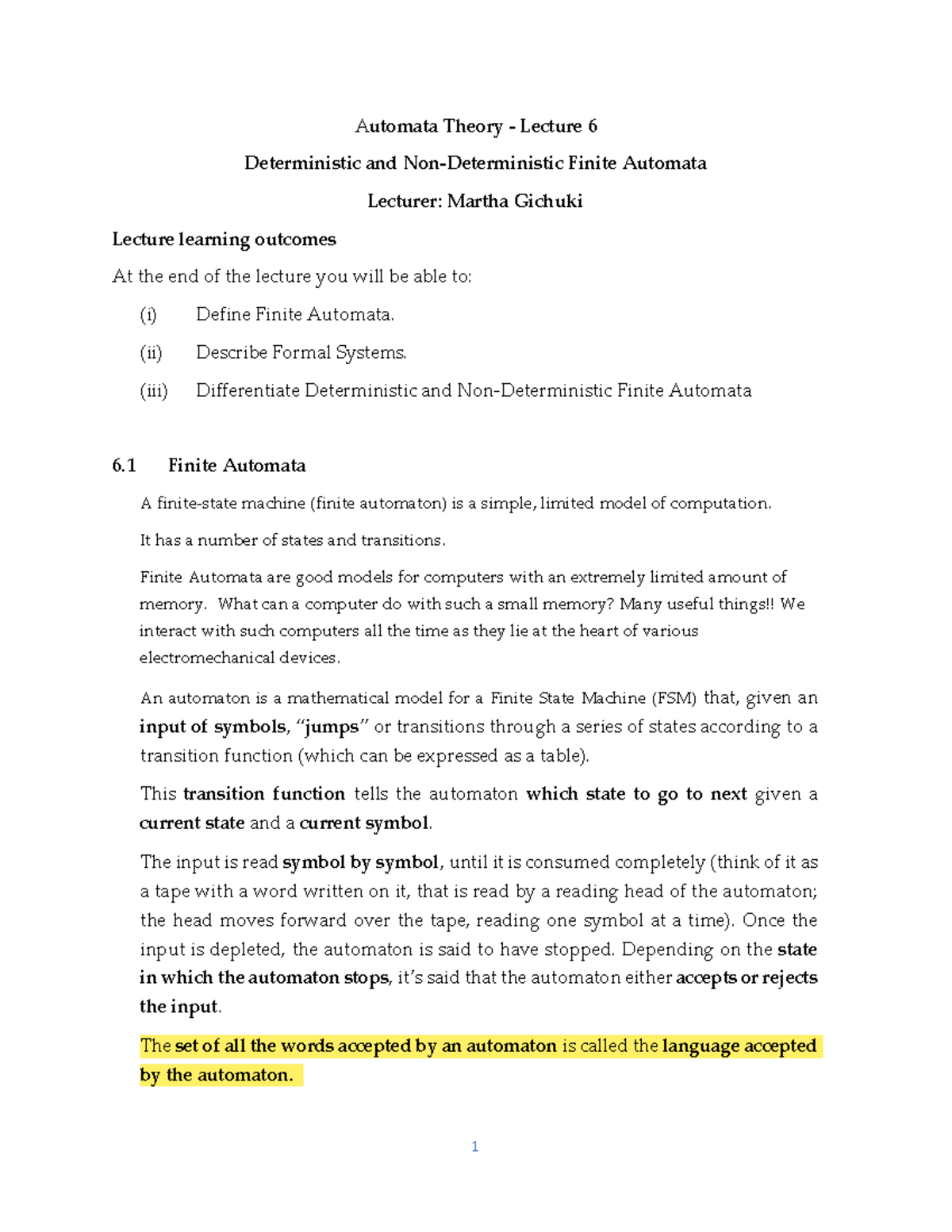 Automata Theory Lecture 6: Deterministic & Finite Automata - Studocu