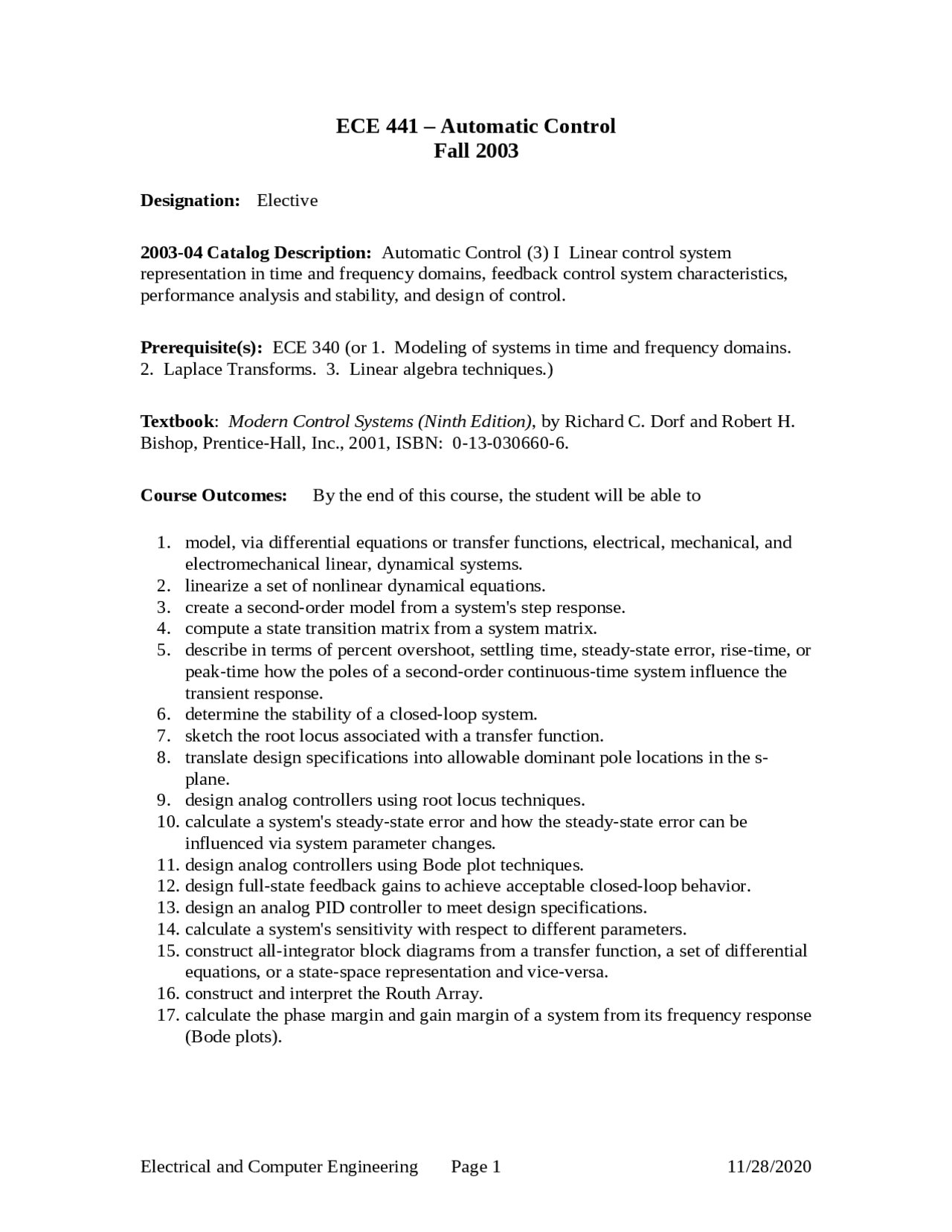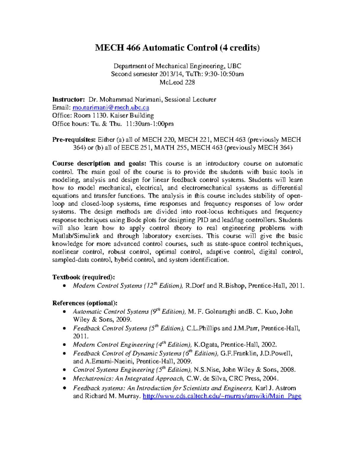 MECH-466 Syllabus: Automatic Control Course Overview and Details - Studocu
