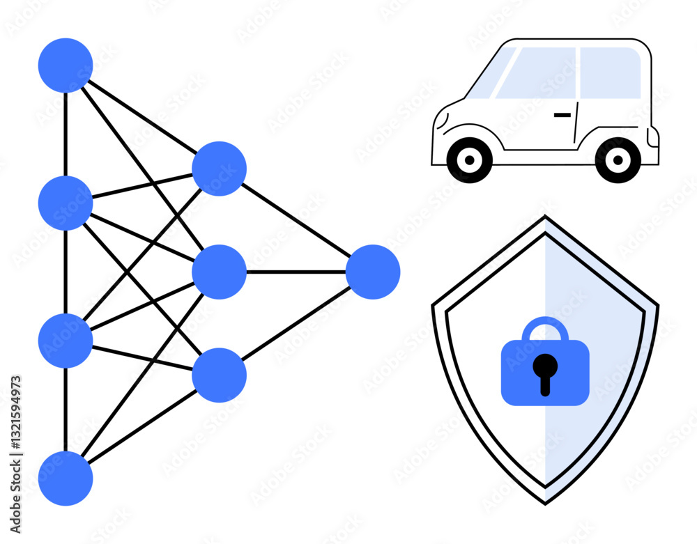 Artificial neural network diagram, car illustration, security shield ...