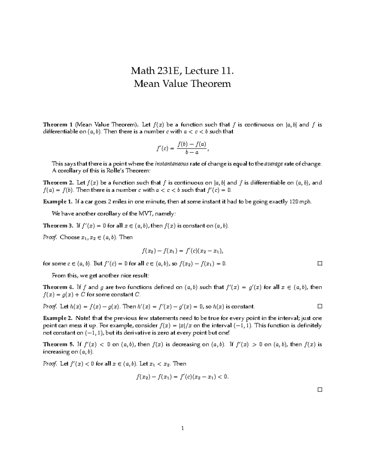Math 231E, Lecture 11: Mean Value Theorem - Studocu
