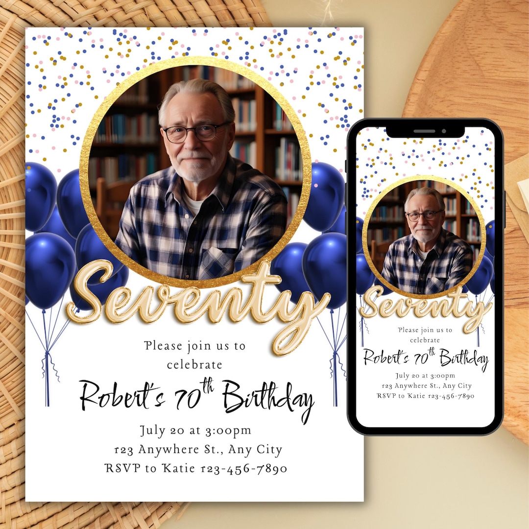 70th Birthday Invitation for Him: Blue & Gold Photo, Canva Template ...