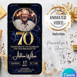 Animated Navy Blue 70th Birthday Photo Invitation, Editable Text Gold ...