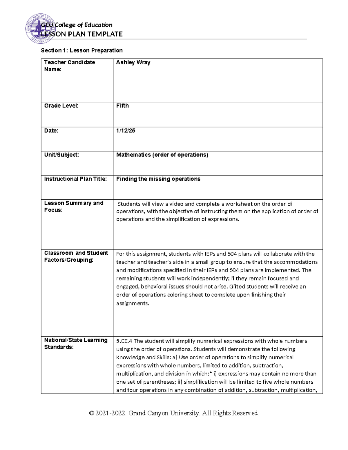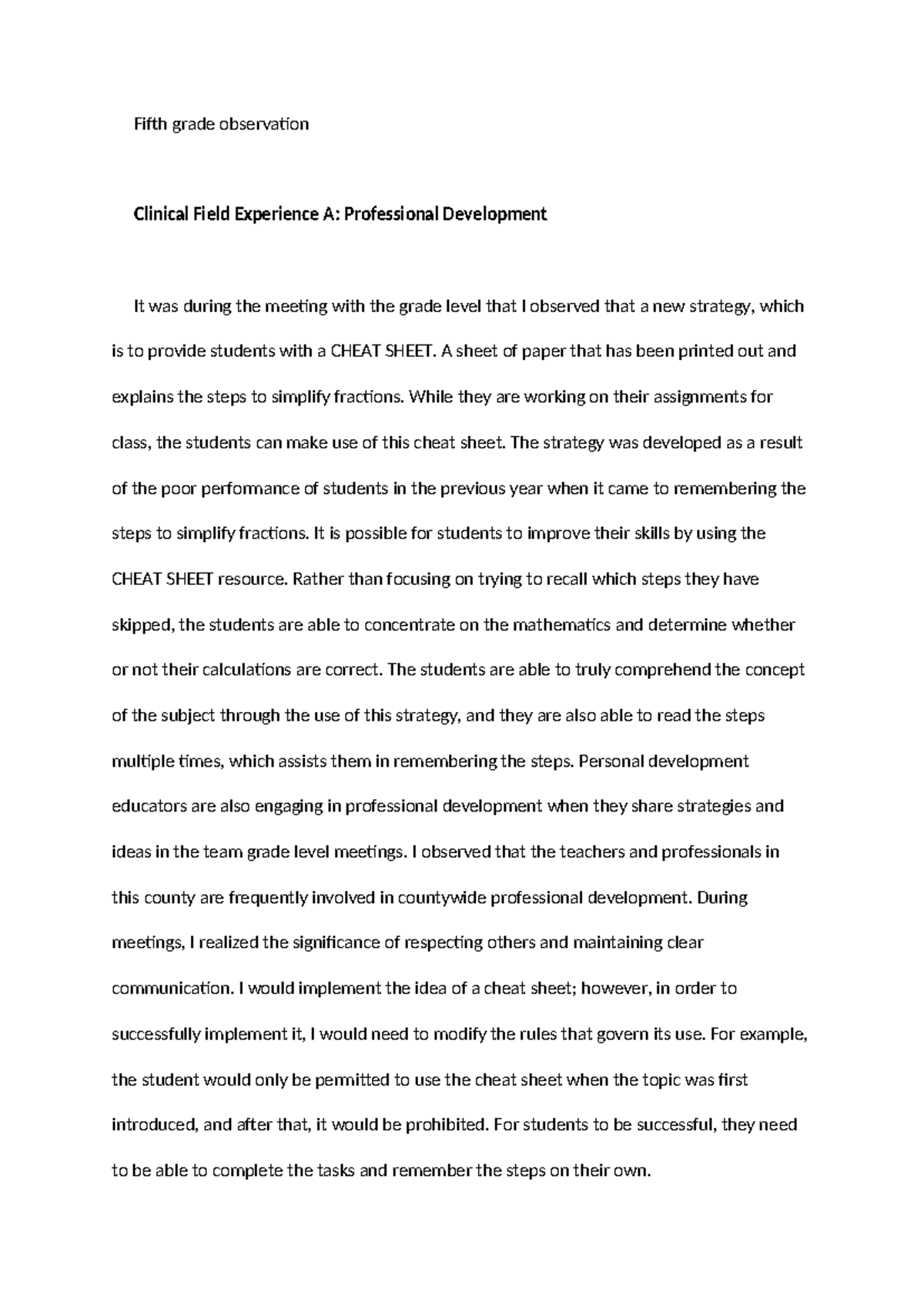 Clinical Field Experience A- Awray - Fifth grade observation Clinical ...