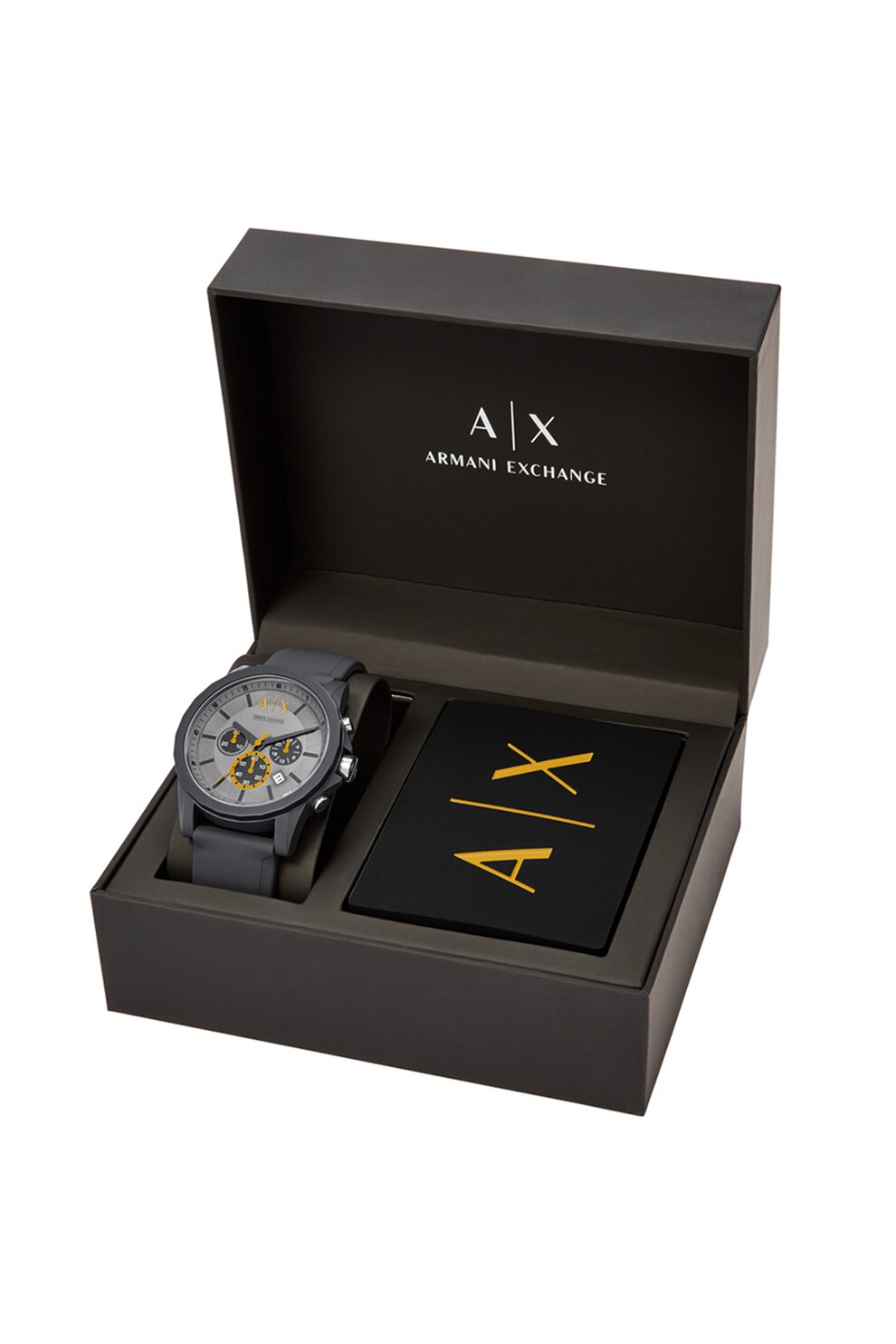 ARMANI EXCHANGE, Часовник с хронограф и калъф за карти, Тъмносив, жълт ...