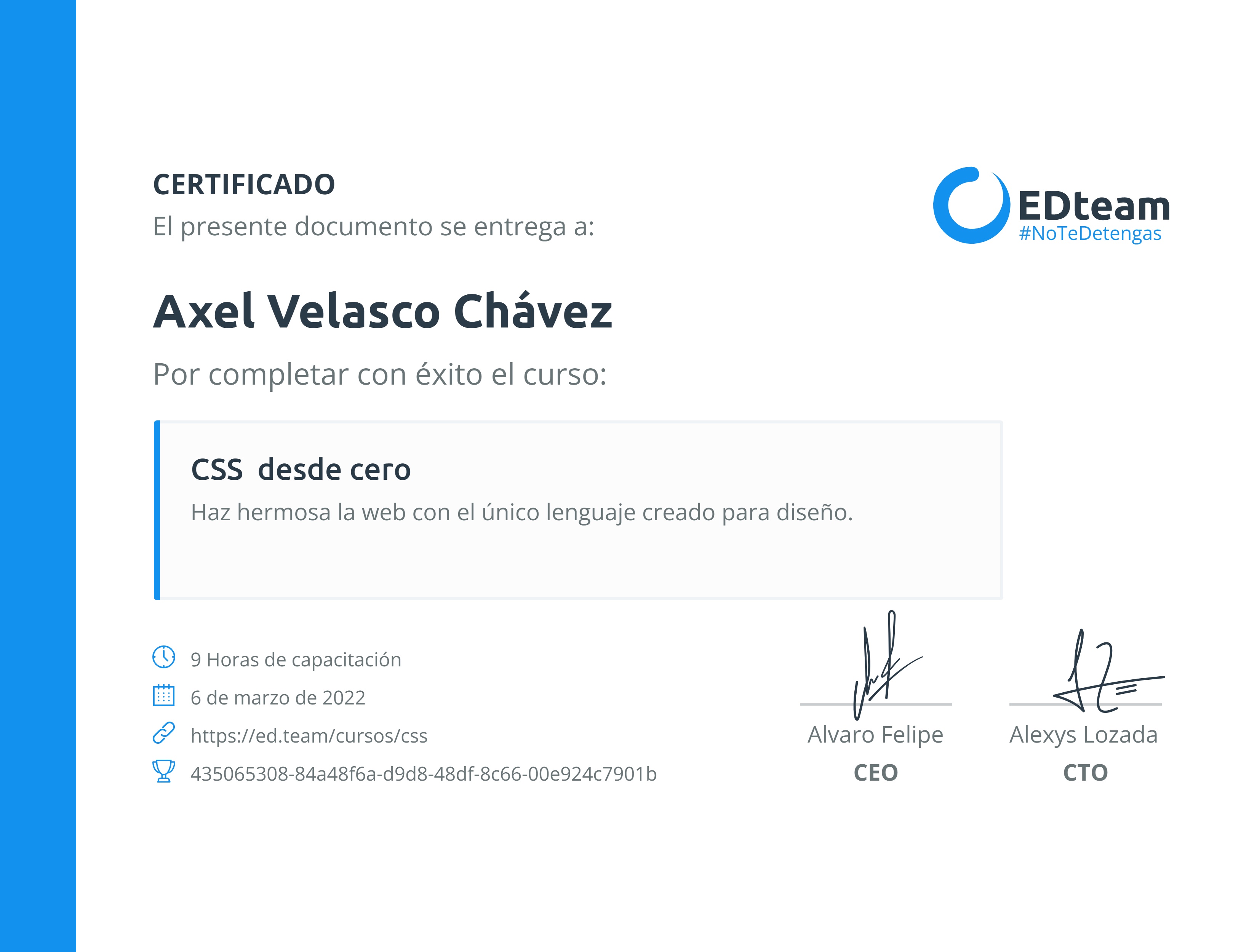 Certificado de Axel Velasco Chávez del curso CSS desde cero (2020) | EDteam