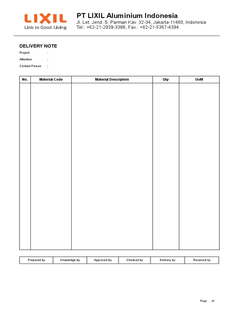 PT LIXIL Aluminium Indonesia: Delivery Note | PDF
