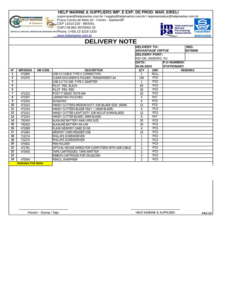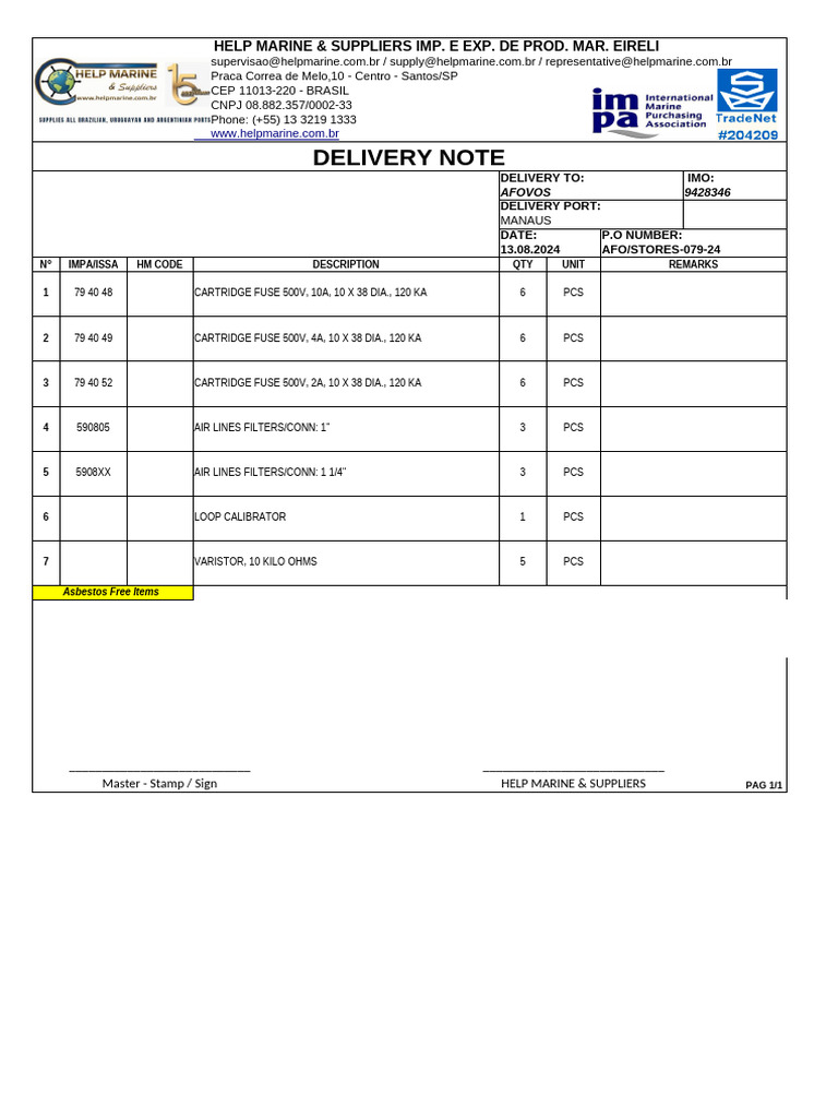 Delivery Note for Marine Supplies | PDF