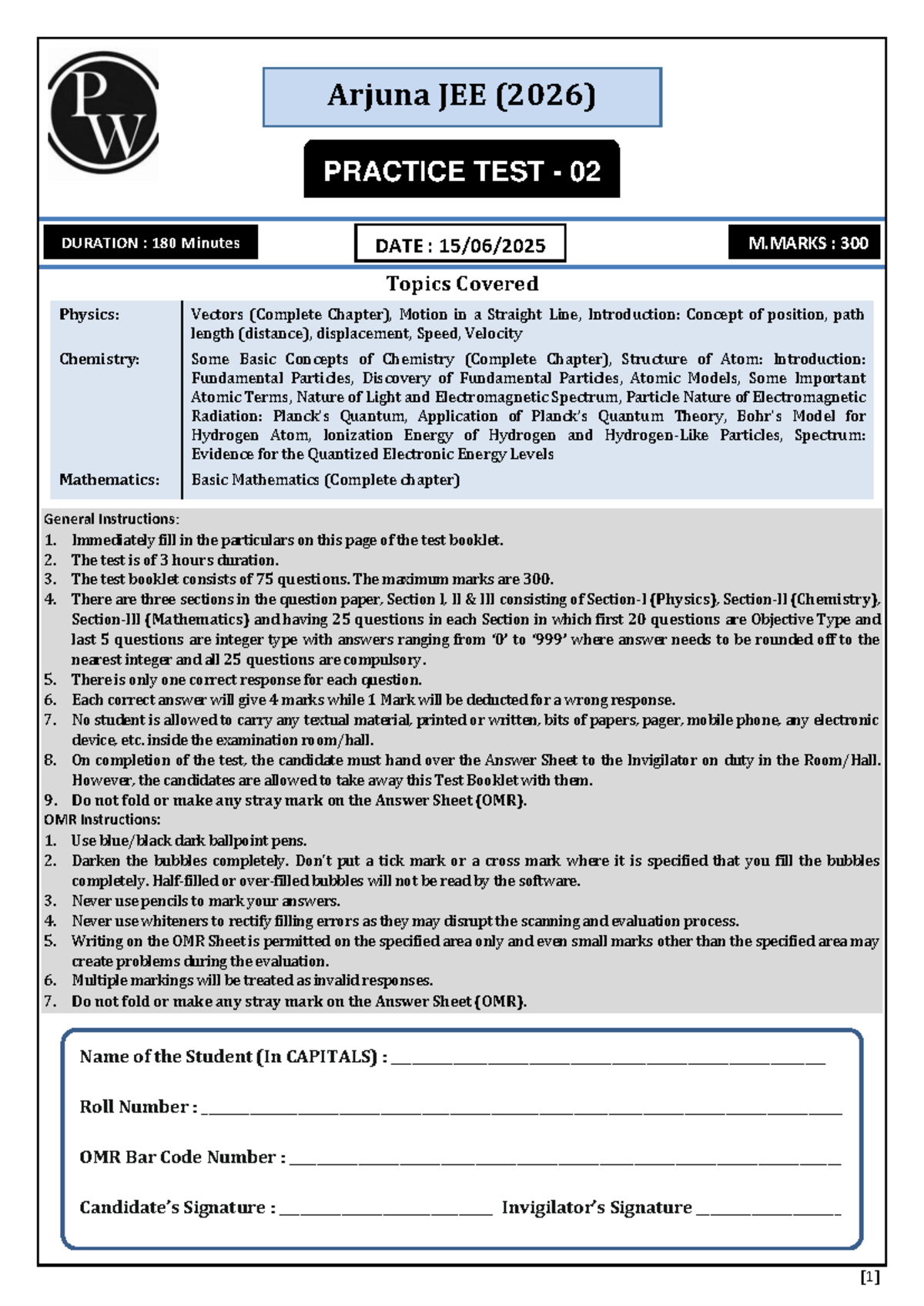 Arjuna JEE (2026) Practice Test 02 - Comprehensive Review - Studocu