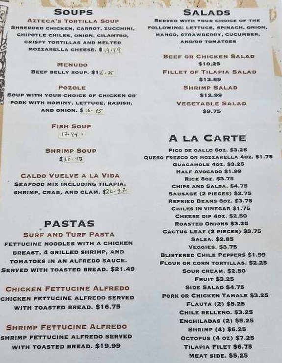 Menu at Los Aztecas Mexican Restaurant, Buena Vista