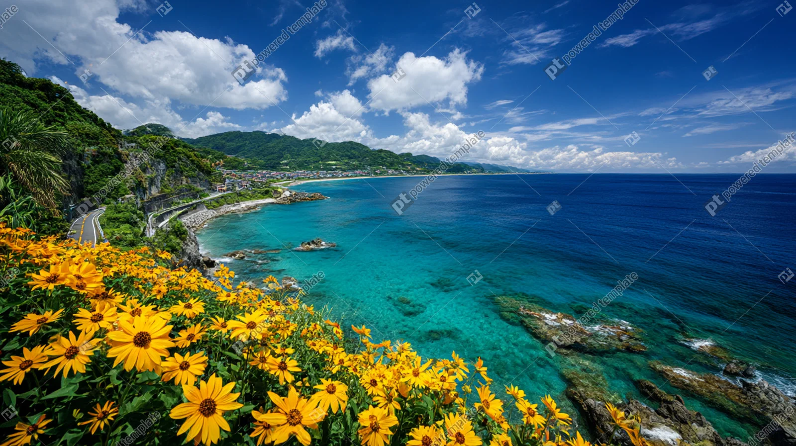 Vibrant Coastal Panorama Golden Flowers Winding Road and Azure Waters ...