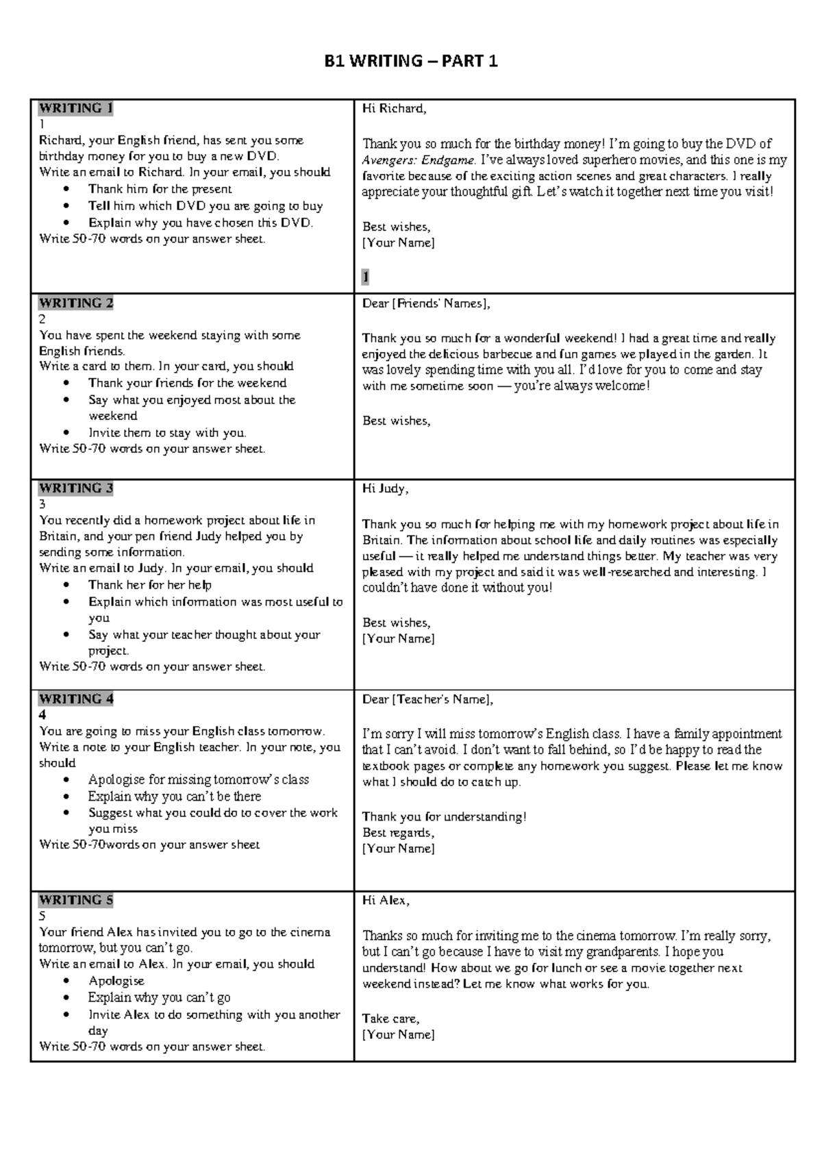 B1 WRITING PART 1 - Email and Card Writing Exercises - Studocu