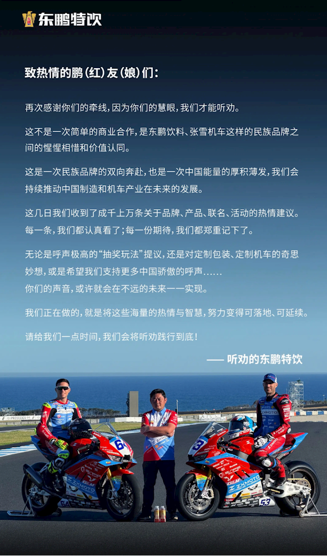押宝张雪机车赢麻了 东鹏特饮:感谢网友牵线撮合