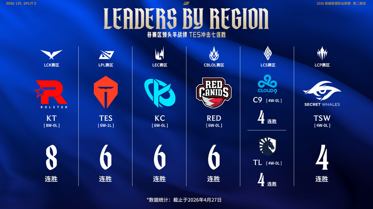 各大赛区领头羊:KT 8连胜领跑LCK,TES今日冲击LPL 7连胜