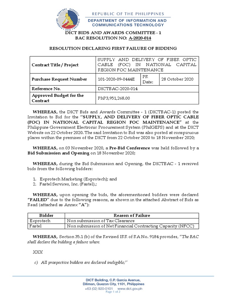 BAC Resolution A 2020 014 First Failure of Bidding For FOC | PDF ...