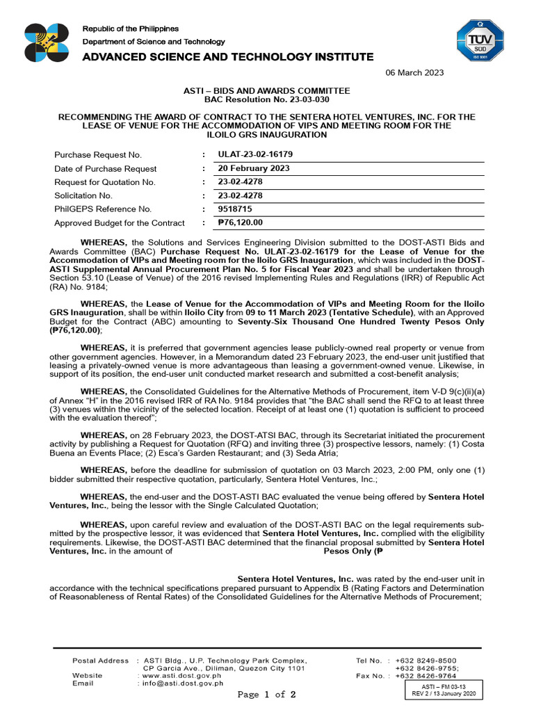 BAC Resolution No. 1 S. 2020 - Procurement Method Recommendation - Studocu