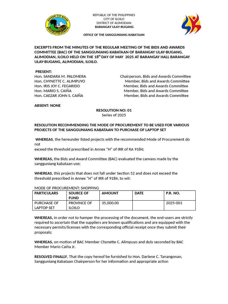 Bac Resolution For The Mode of Procurement Services For Pakyaw Labor ...