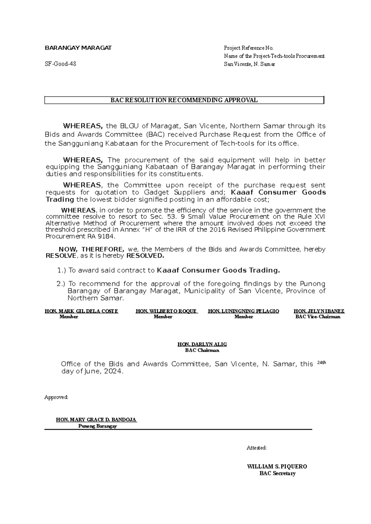 BAC RESOLUTION DECLARING LCRB & RECOMMENDING APPROVAL | PROCUREMENT ...