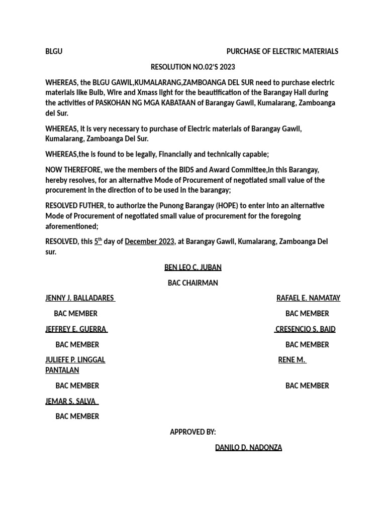 Bac Resolution For The Mode of Procurement Services For Pakyaw Labor ...