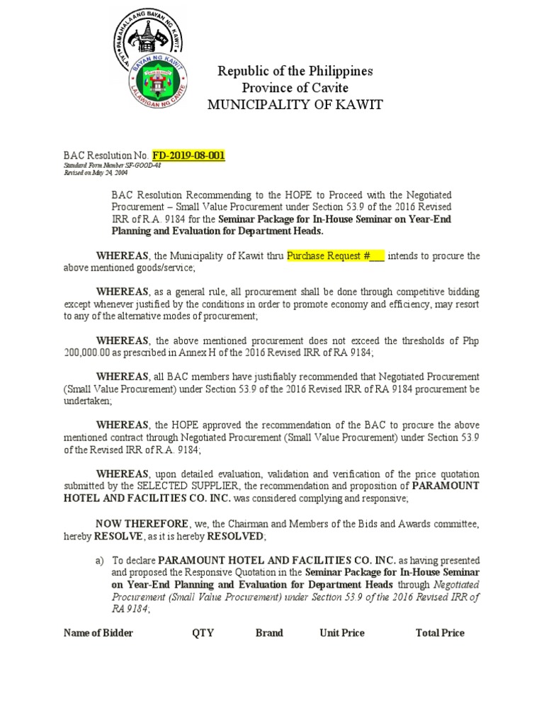 BAC Resolution Recommending Award of Contract | Download Free PDF ...