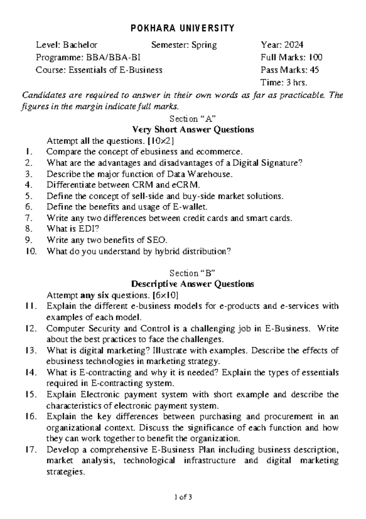 BBA-BI 6th Semester 2024 Spring - Board Exam Questions - Studocu