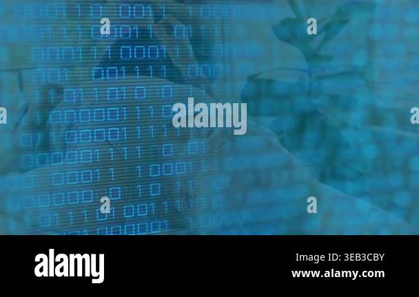 Animation of binary coding data processing over glowing computer ...