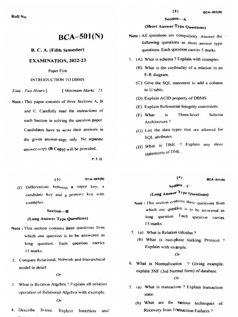 Bca 5 Sem Introduction To Dbms Bca 501 N 2023 | PDF