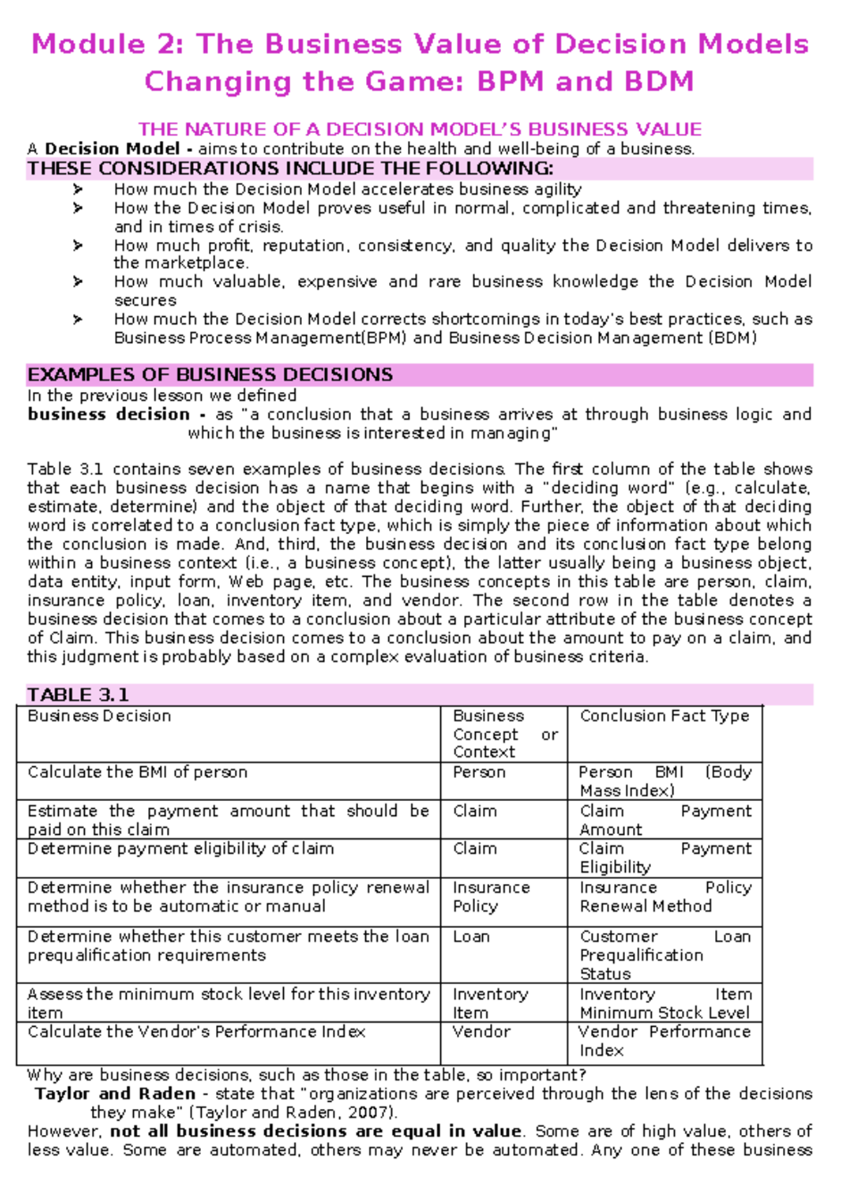 Module 2: The Business Value of Decision Models in BPM & BDM - Studocu