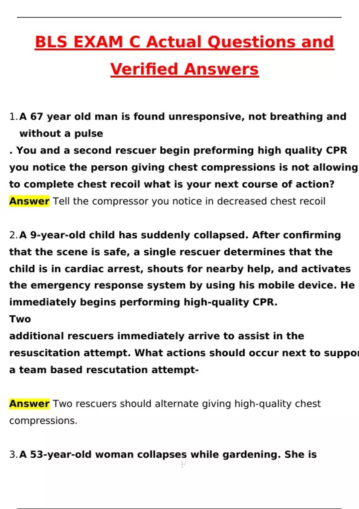 Cardiac Arrest BLS Exam Questions with Correct Answers - Cardiac Arrest ...
