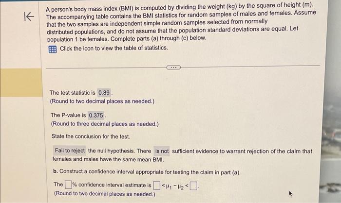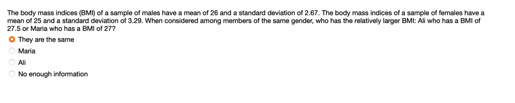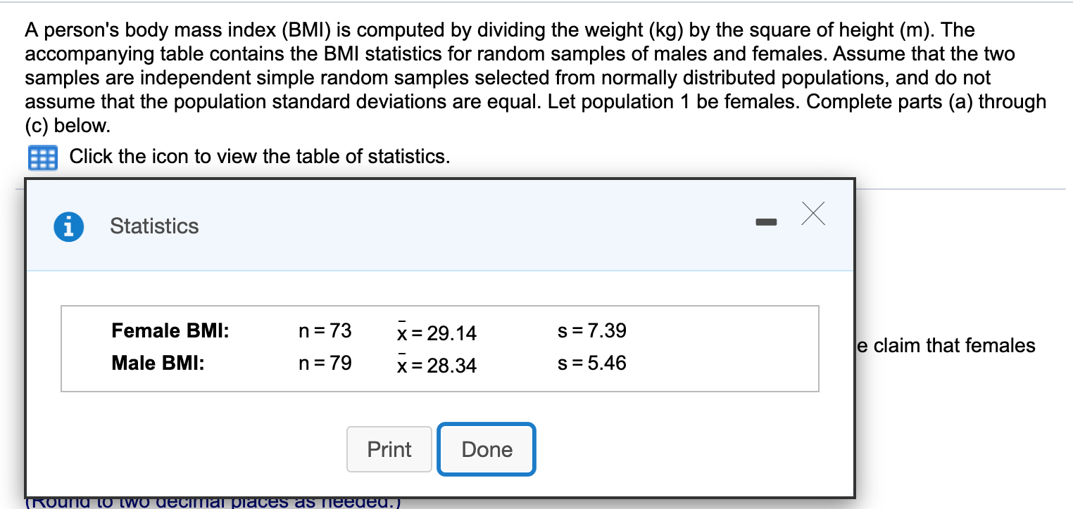 Solved The body mass index (BMI) for a sample of men and a | Chegg.com