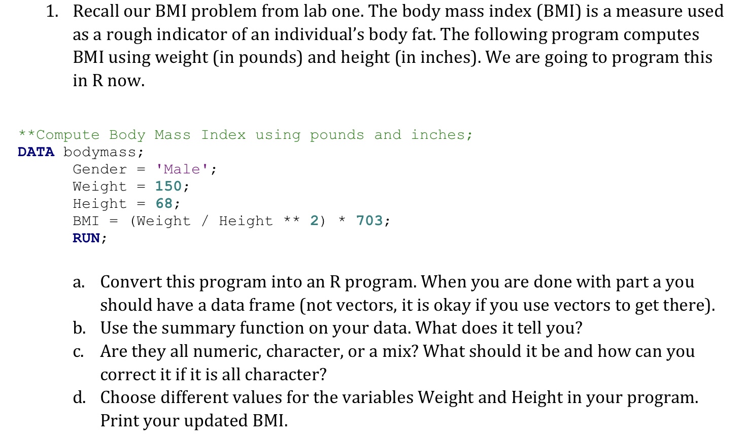 Solved 1. Recall our BMI problem from lab one. The body mass | Chegg.com