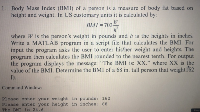 SOLVED: Write a Matlab program to determine body mass index (BMI ...