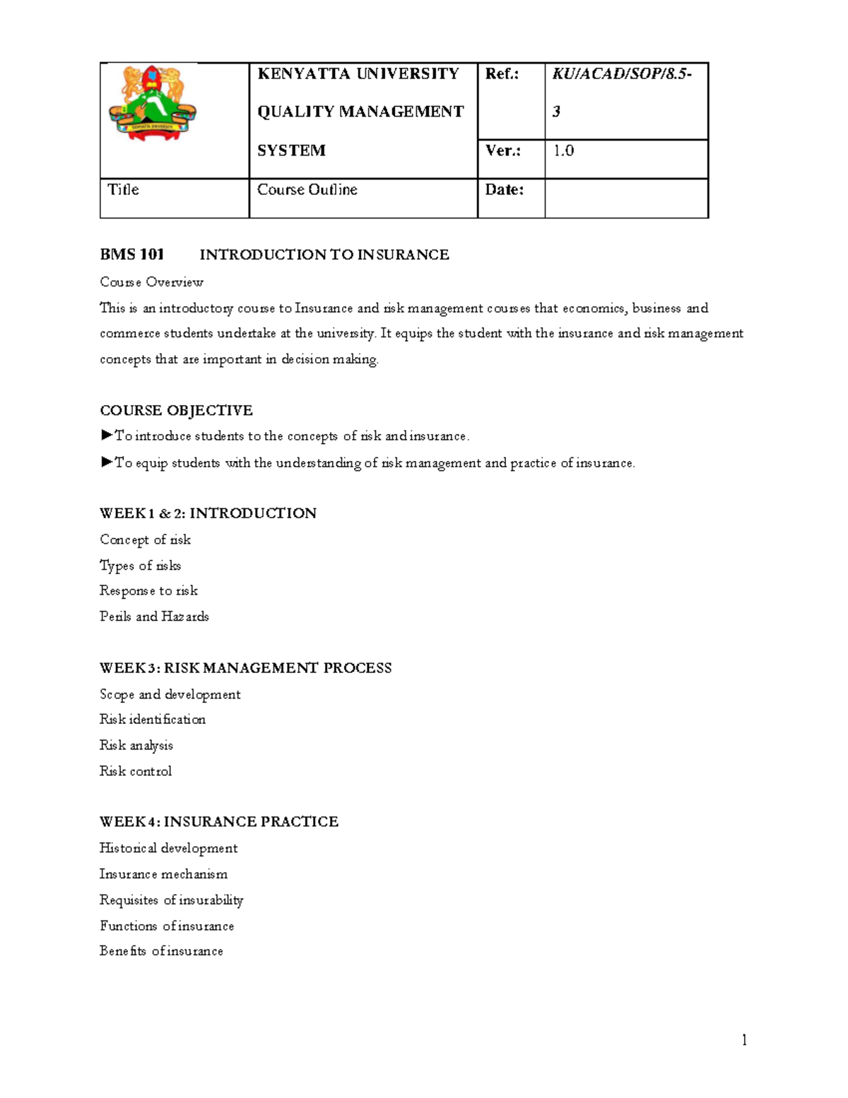 BMS 101 Course Outline - Introduction to Insurance & Risk Management ...
