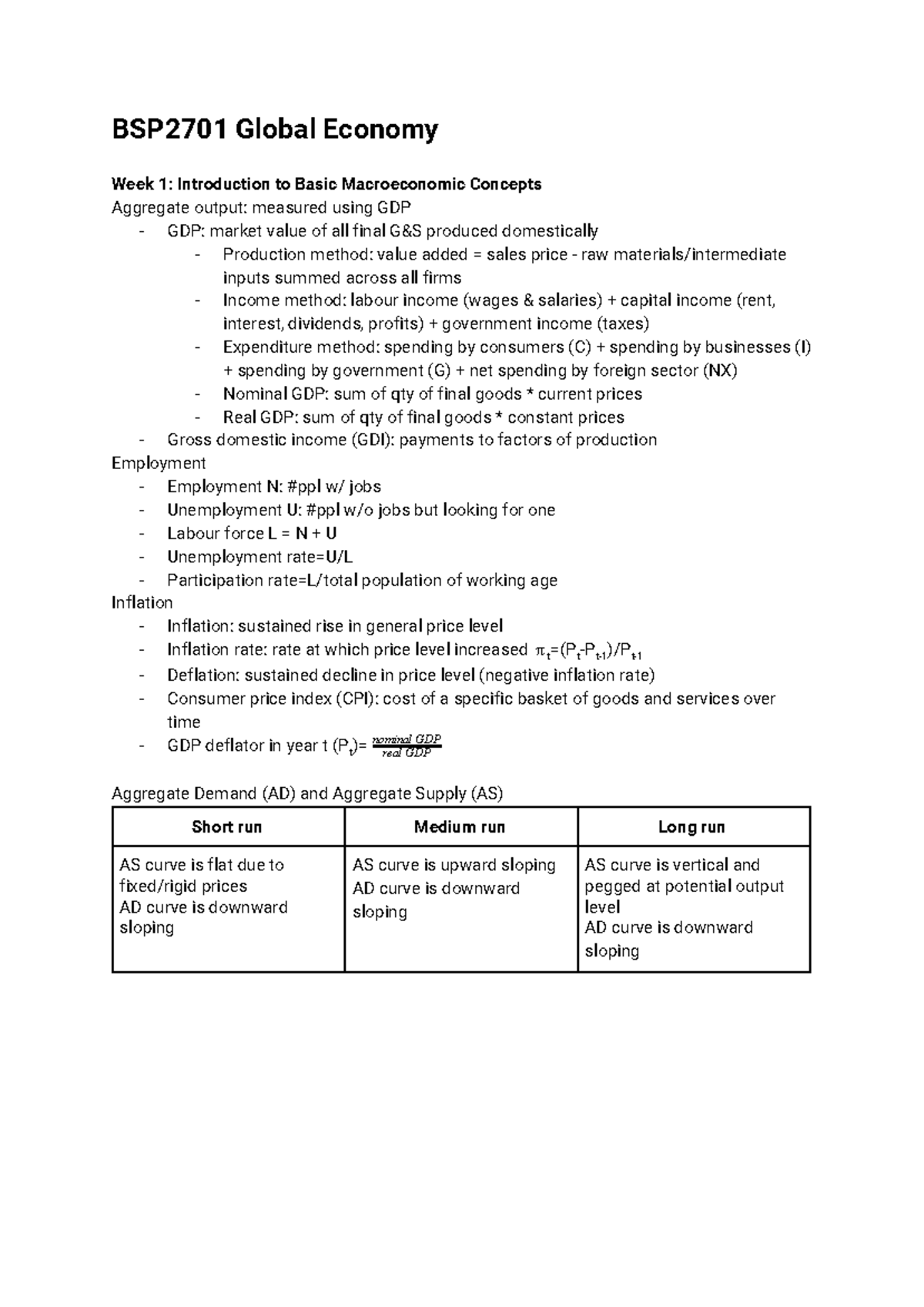BSP Senior Notes - BSP2701 Global Economy Week 1: Introduction to Basic ...