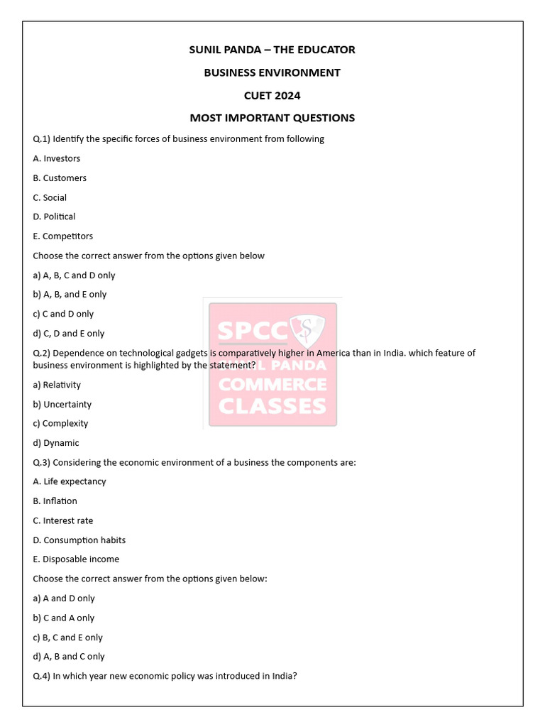 Business Environment BST MCQ CUET Questions (1) - 42301295 | PDF ...