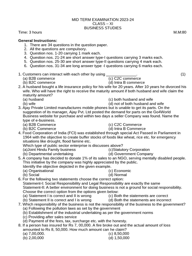 BST Mid Term Question Paper 11th Class | PDF | Corporations | Cooperative