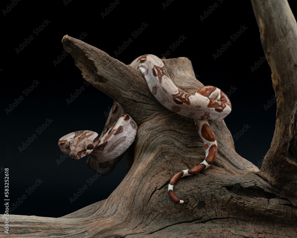 Baby boa constrictor on a big old stump. Little Boa imperator on black ...