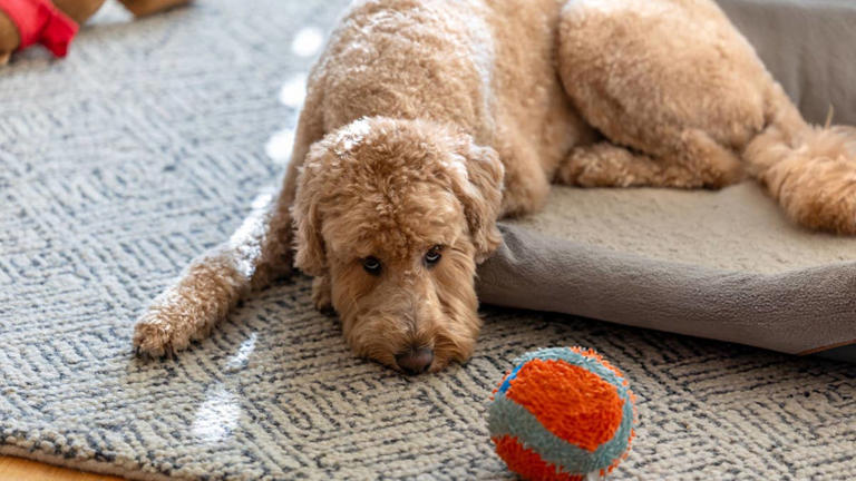 Goldendoodle's gentle attempt to play with human baby is pure sweetness