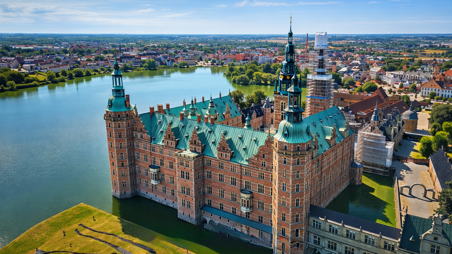 A castle built right along the edge of a lake in Denmark