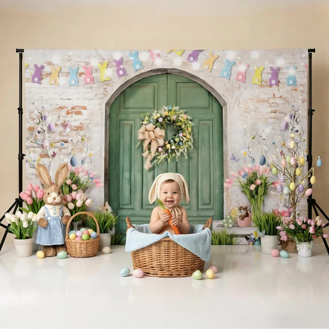 EASTER BACKDROP GREEN Wooden Doors Bunny Spring Photography 82x60 Inch ...