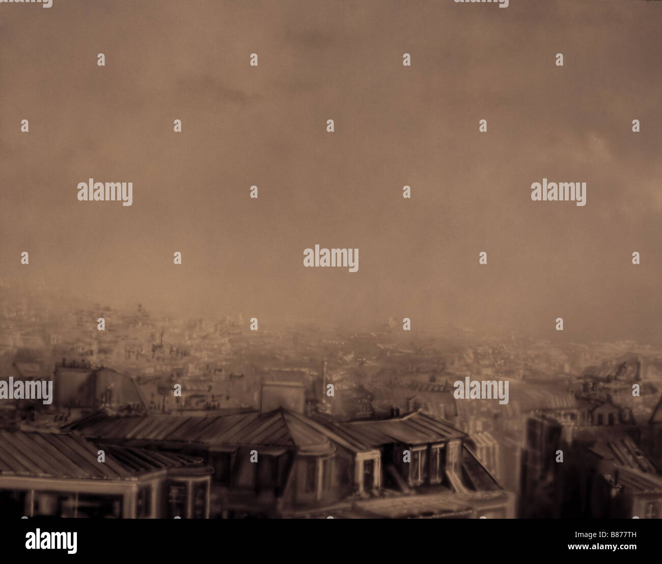 Painted backdrop. View over city roofs Stock Photo - Alamy