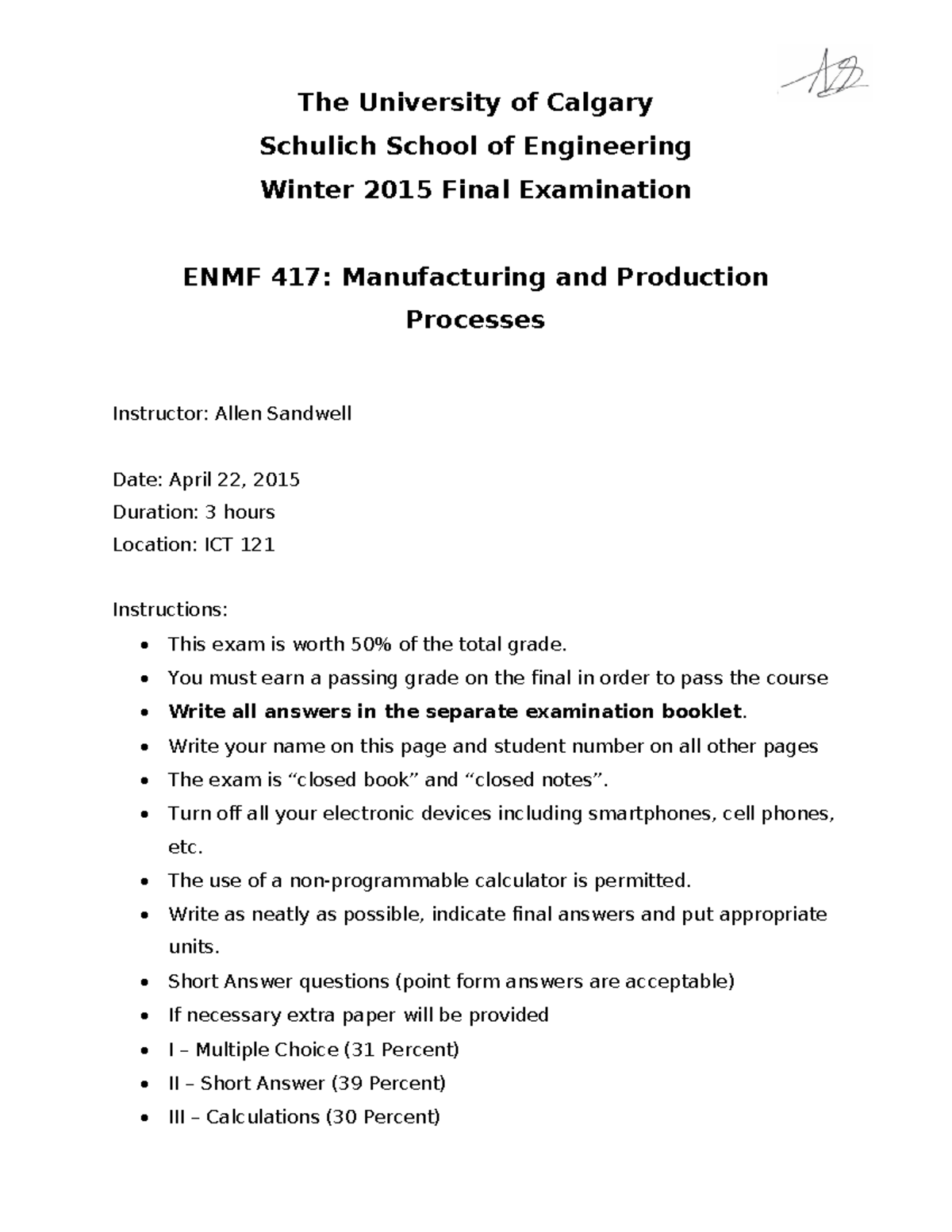 W2015 Final Exam - Past Paper - The University of Calgary Schulich ...