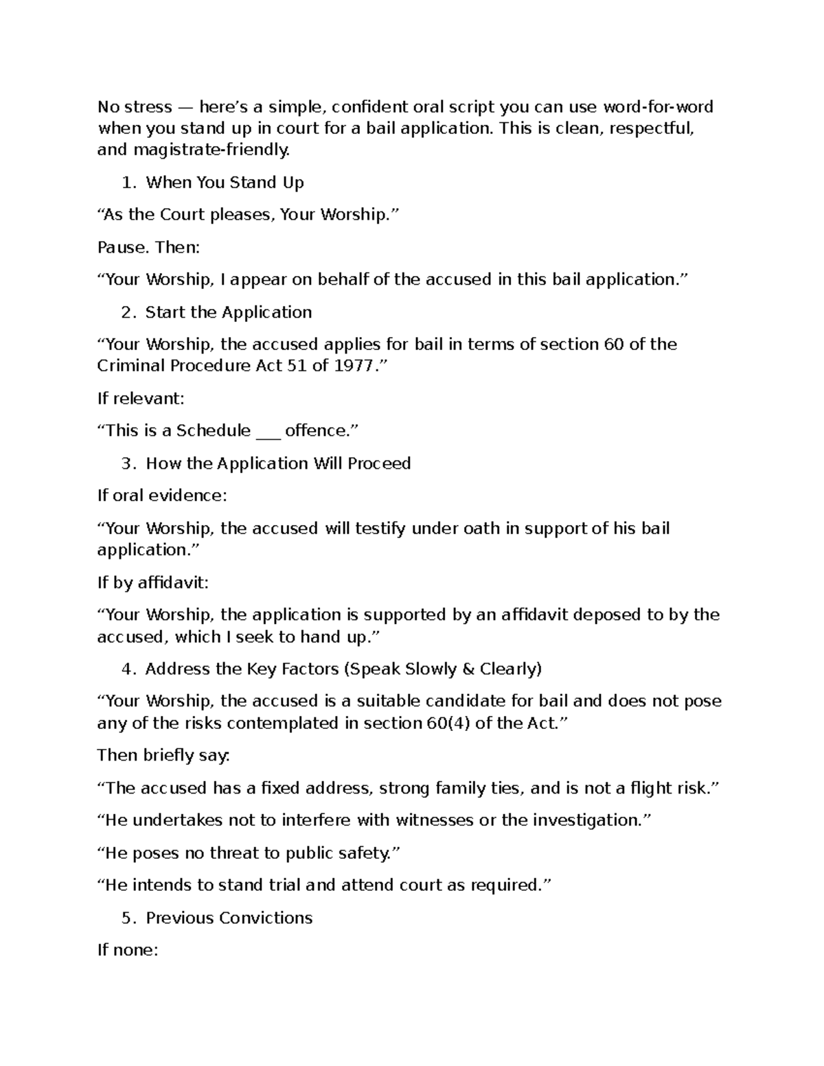 Bail application Script - Good afternoon your honour, my name is ...