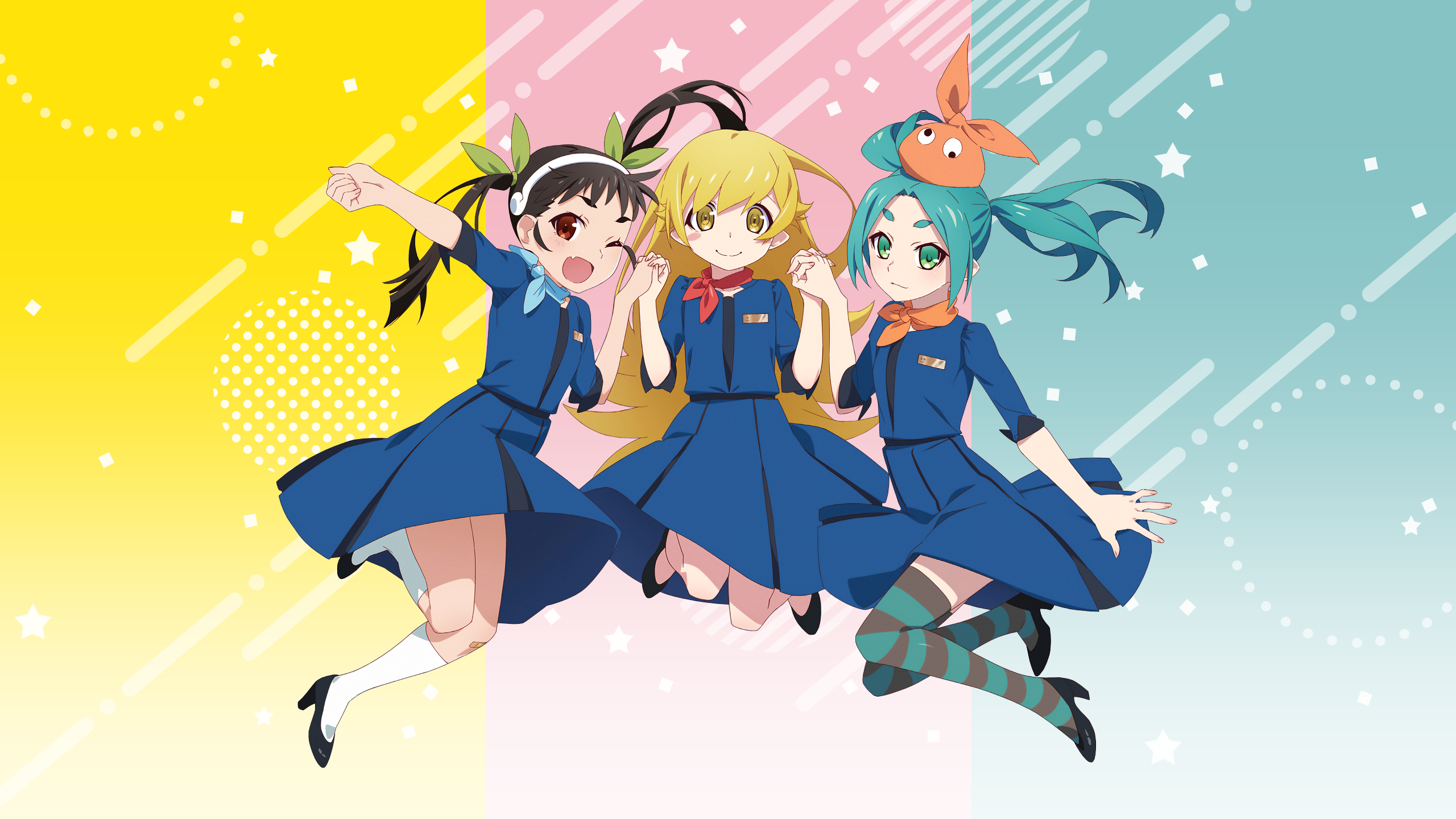 Bakemonogatari Trio HD Wallpaper – Shinobu Oshino & Friends in Action