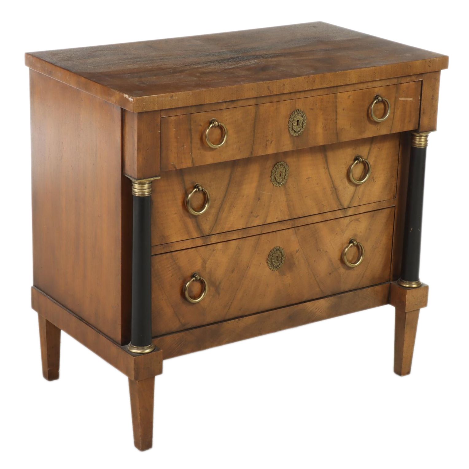 Baker Empire Style Walnut and Parcel-Ebonized Three-Drawer Bedside ...