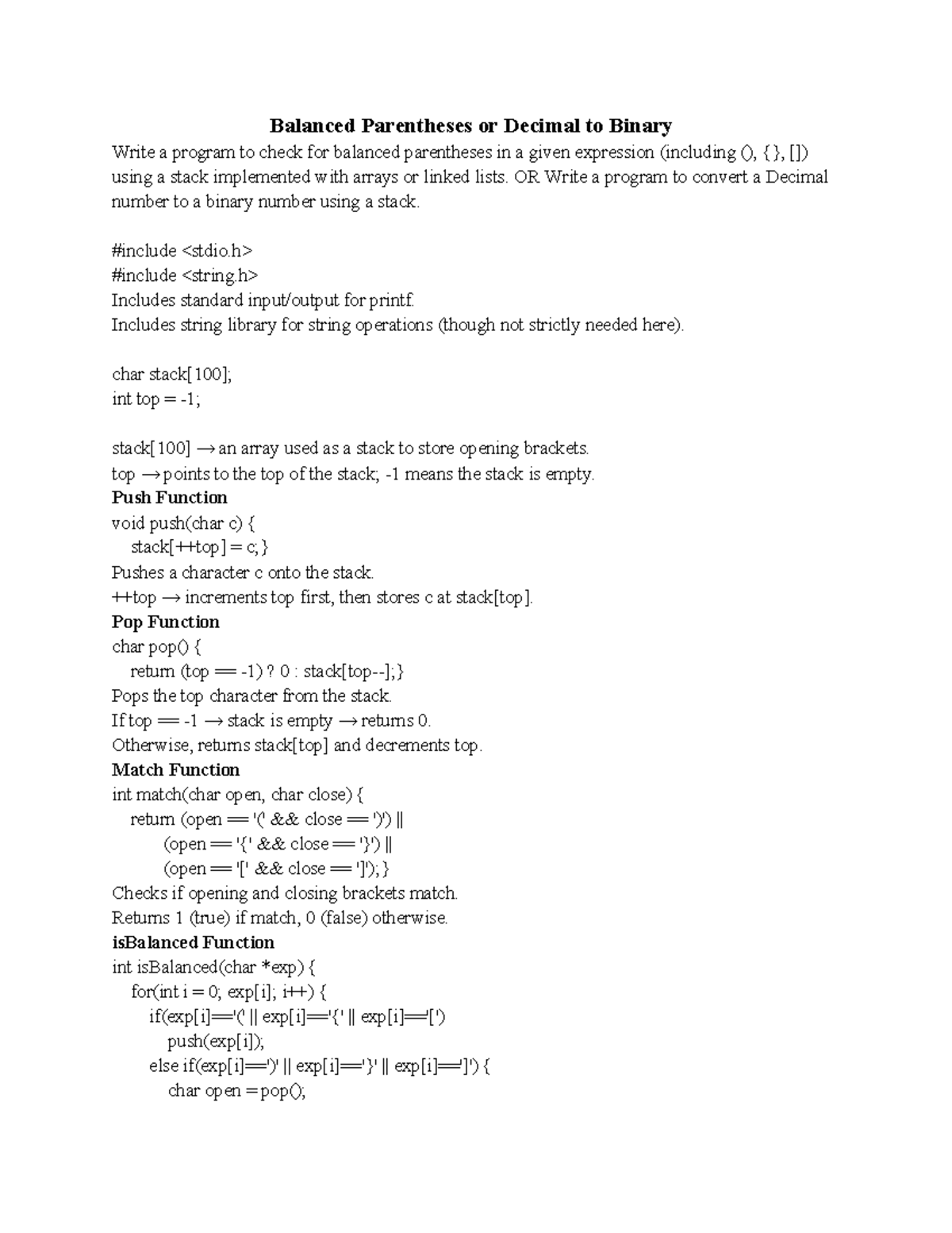 Balanced Parentheses & Decimal to Binary - SPPU SE Notes - Studocu